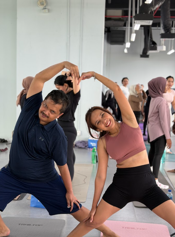 Menjelang akhir sesi, Coach Dian mengumumkan yoga challenge yang langsung bikin suasana makin kompetitif tapi tetap fun. Tantangannya: pasangan dengan durasi pose terlama jadi pemenang.