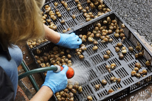 - Pemilihan siput: Jenis siput yang digunakan adalah helix aspersa atau crypthomphalus aspersa. Siput tersebut ditaruh dalam sebuah jaring lalu didiamkan di tempat yang gelap dan bebas gangguan.