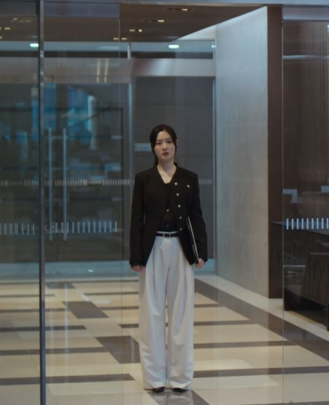 Kang Hyo Min, lead actors di drama 12 episode ini kalau dilihat-lihat punya core outfit yang simpel tapi jadi trademark karakternya banget: Structured shirt, dan tailored blazer yang dipadukan dengan cullote pants. Gampang banget di-recreate, bikin kamu auto kelihatan rapih tanpa perlu effort berlebihan.